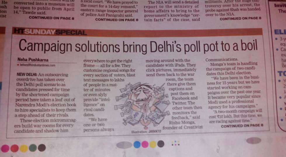Featured on Hindustan Times front page for political campaign management and election campaigning during 2015 Delhi Elections, Creativizt, the Best Political Campaign Management Company in Delhi, is among Top Political Campaign Management Companies in India because of our successful election campaigning including social media promotions on platforms like Facebook, Twitter & Linkedin for candidates from several different political parties.